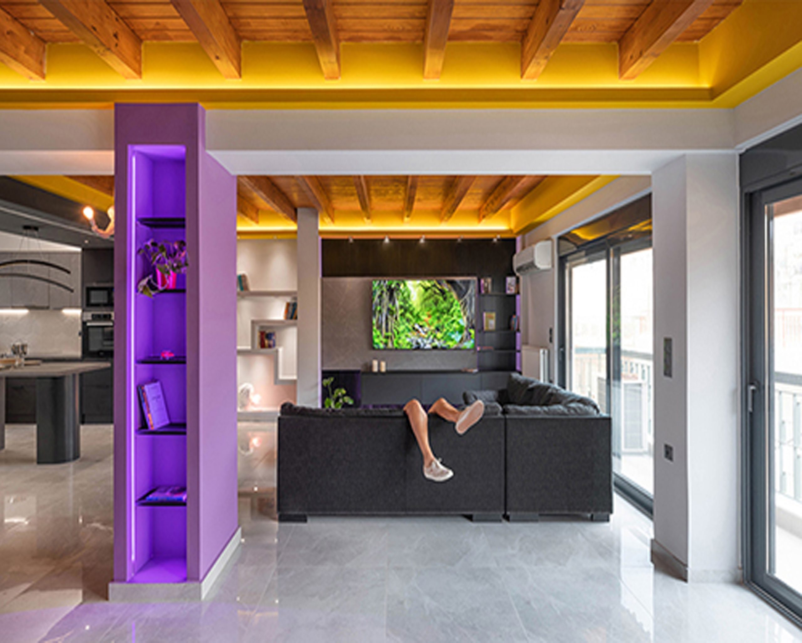 The above architectural manipulations combined with the indirect artificial lighting, form a stable “living” framework and at the same time contribute to the “switching” living scenario from a production studio to a residence and vice versa.