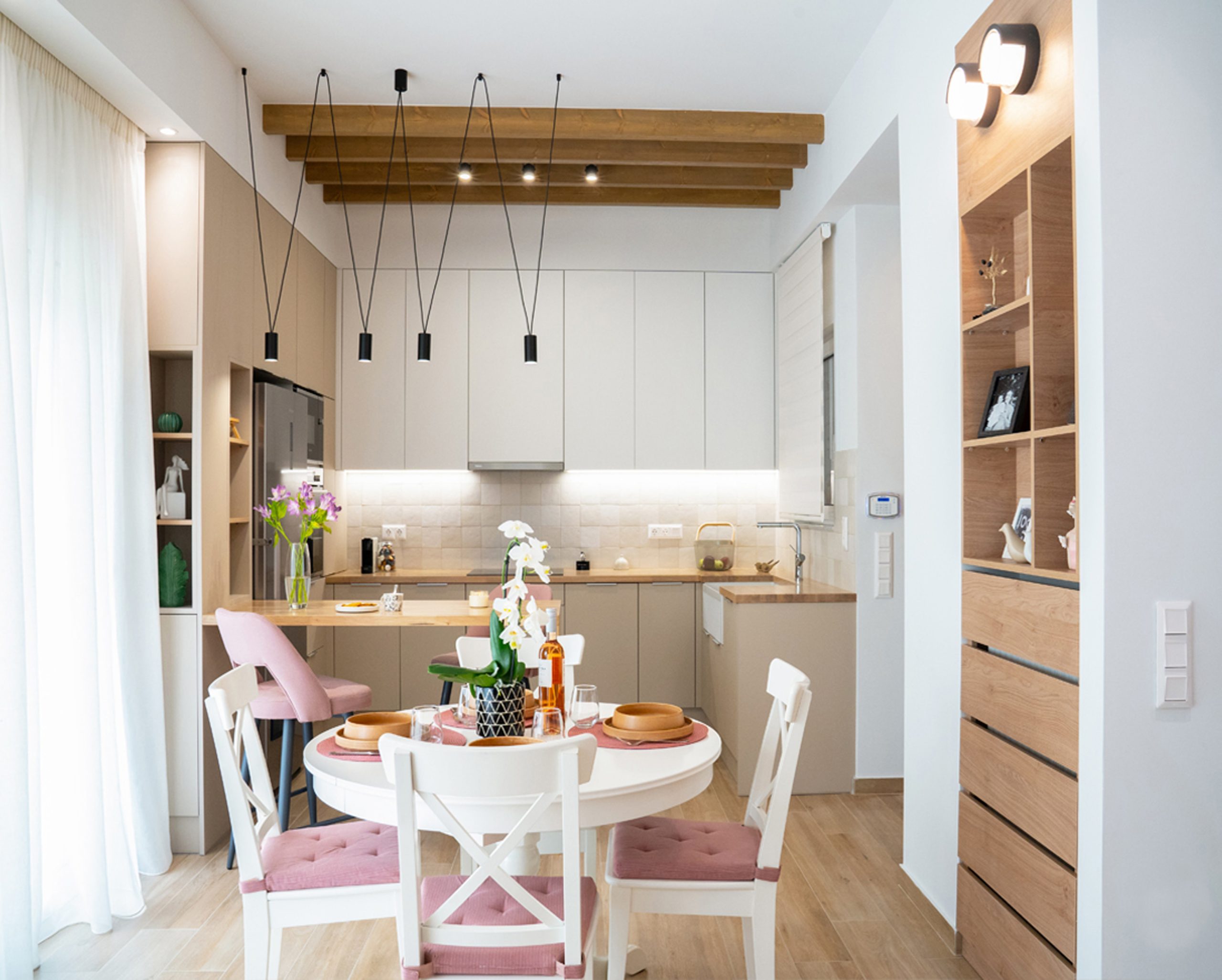 The architectural solution is enhanced by the choice of materials aiming at the clarity of geometries. The choice of common wooden oak floor throughout the apartment except the bathrooms, combined with the pastel color options in the masonry, formed an excellent background for the handmade wooden structures of the entrance, kitchen, dining room and wardrobes of the bedrooms. The strategic choice of tiles in the kitchen and bathrooms emphasize the small scale and detail of the alternation of materials. The linen curtains with earthy colors, the round restored dining room and the special objects of decoration continue the narrative of the synthetic idea.